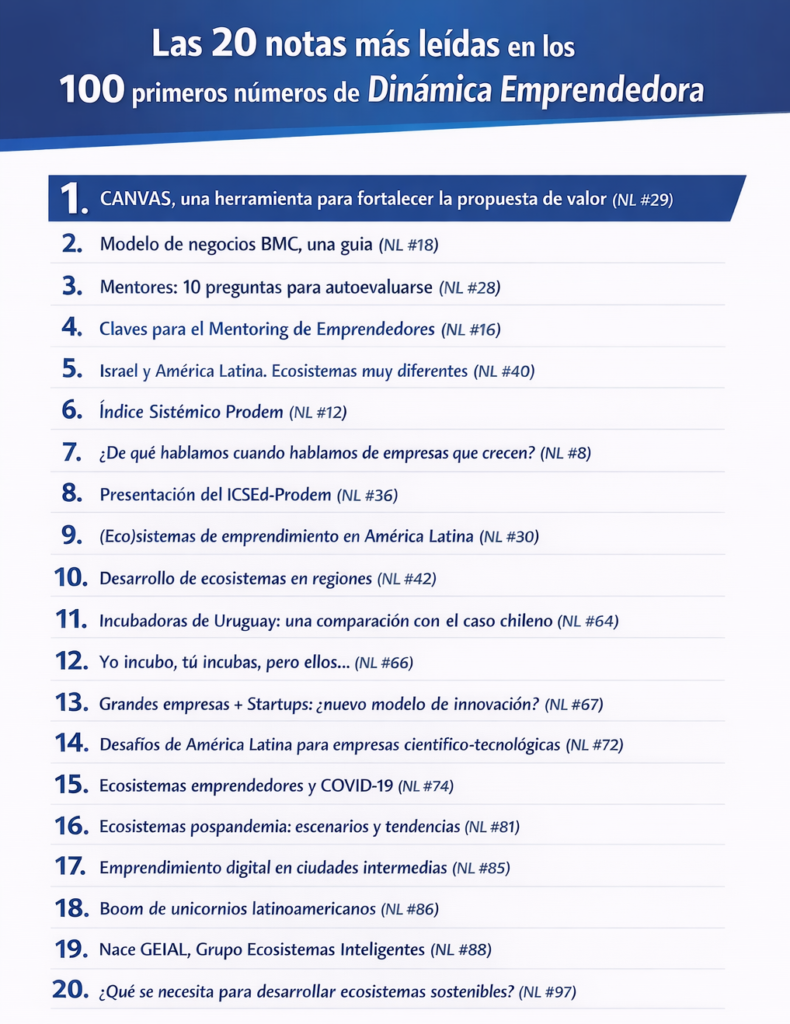 Especial Número 100: A quince años de su lanzamiento, Dinámica Emprendedora llega a su edición número 100. Esta nota recorre los principales hitos del camino recorrido, en un contexto marcado por importantes cambios y evoluciones en los ecosistemas latinoamericanos, así como la aparición de nuevos desafíos para el emprendimiento, los ecosistemas y las políticas públicas en la región.