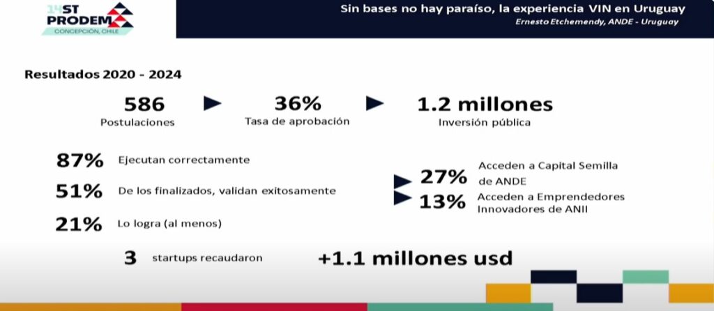 Los resultados compartidos por el estudio muestran que el proyecto VIN ha demostrado ser una herramienta efectiva para acompañar a emprendedores en la etapa inicial de sus proyectos. Entre 2020 y 2024, hubo 586 postulaciones de las cuales se aprobaron unas 210 (el 36%) que implicaron una inversión pública de 1,2 millones de dólares. El 87% de los proyectos aprobados logró finalizar, y de estos, poco más de la mitad (51%) lograron validar sus hipótesis técnicas y comerciales.